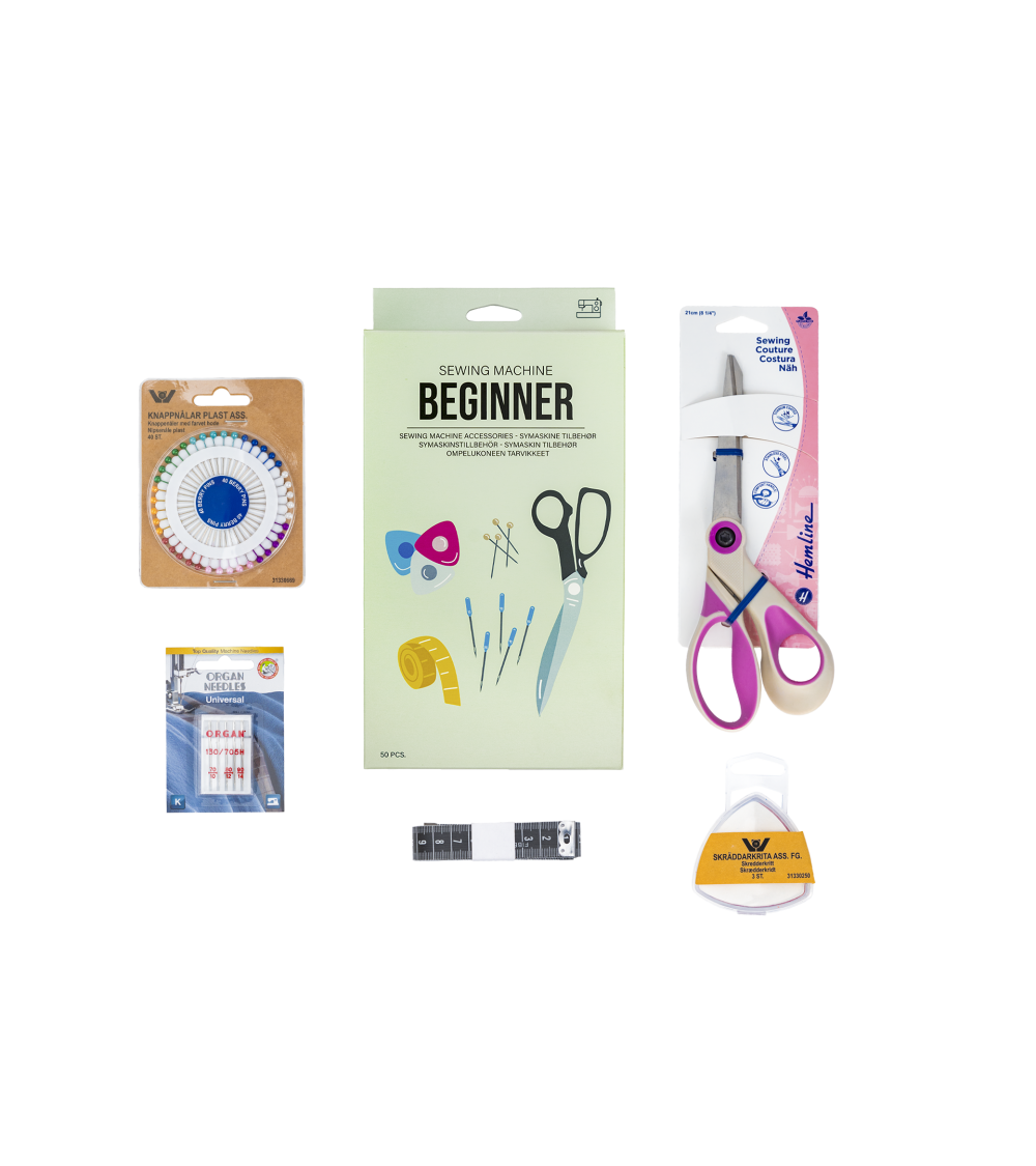 Beginner tarvikepaketissa on tarvikkeet helpottamaan ompelun aloittamista.