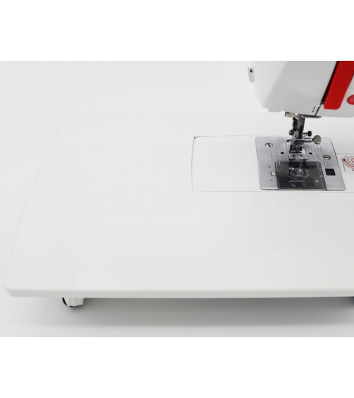 Poistamalla säilytyslokeron ompelukone voidaan helposti muuttaa vapaavartiseksi ompelukoneeksi. Putkimaisia ompeluprojekteja, kuten housureunat ja hihat, voidaan nyt helposti työstää. Mukana tulevalla jatkopöydällä työtasoa voidaan lisätä, jos joudut työskentelemään suurempien projektien kanssa, kuten verhot, vuodevaatteet tai vastaavat.